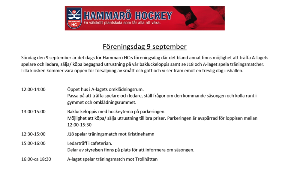 På söndag är det dags för föreningsdag där det finns möjlighet att köpa/ sälja begagnad utrustning på vår bakluckeloppis, besöka A-lagets ledare och spelare i omklädningsrummet, kolla när J18 och A-laget spelar träningsmatcher och träffa andra hockeyintresserade i ishallen. Tider för dagen ser ni på bilden ovan och vi hoppas på en trevlig dag tillsammans!