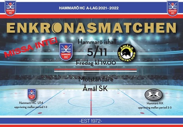 Fredagen den 5/11 tar Hammarö HC emot Åmåls SK i årets enkronasmatch klockan 19,00. Vi ser fram emot en härlig fredagkväll i Hammarö Ishall med bra inramning. Vill du som privatperson eller företagare vara en del av tillställningen? Genom att bidra med valfri summa per åskådare så är du med och stöttar föreningen samt får synas i hallen under matchen. För mer info kontakta Tomas Rask via info@geronimo.se Det kommer under första periodpausen bli uppvisning av Team 14/Hockeyskolan och pausen mellan andra och tredje perioden blir det uppvisning av Hammarö Konståkningsklubb. Hoppas vi ses i hallen nu på fredag!